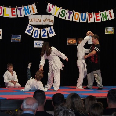 Děti předvedly akrobacii - kotouly, skoky, přemety, přeskok na slze, Pódiové skladby choreografie pro letošní sezónu a aikidokové znehybňovací a hodové techniky.